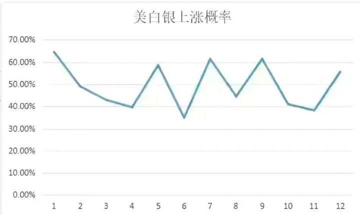 从图中我们可以看到,每年的9月是上涨概率最大的月份,金银在9月份都趋向于上涨,主要原因在于9月往往进入消费旺季,印度的排灯节等重大节日以及中国的国庆消费促使金银价格上行。同时,我们也要注意12月往往也是上涨概率较大的月份,主要在于年底节假日较多,消费需求较为旺盛。