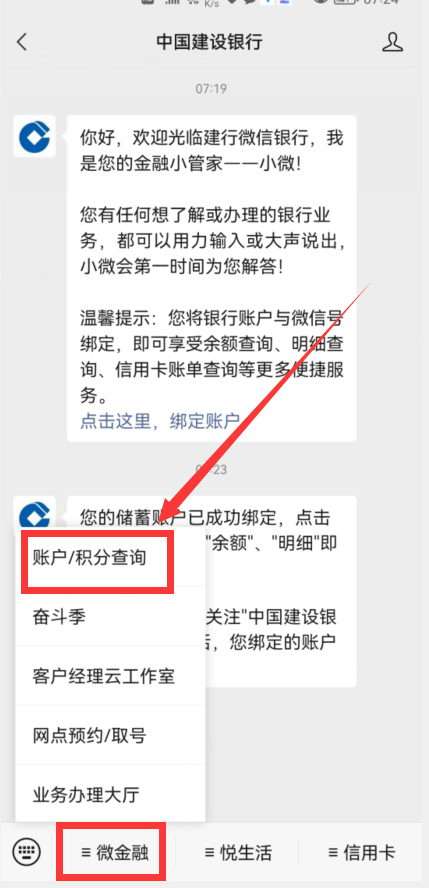 绑定好银行卡后,我们就可以通过银行的微信公众号,来查看银行卡余额和交易情况了。在微信上打开银行公众号,点击左下角的“微金融”按钮,就会弹出上拉菜单(如下图)。