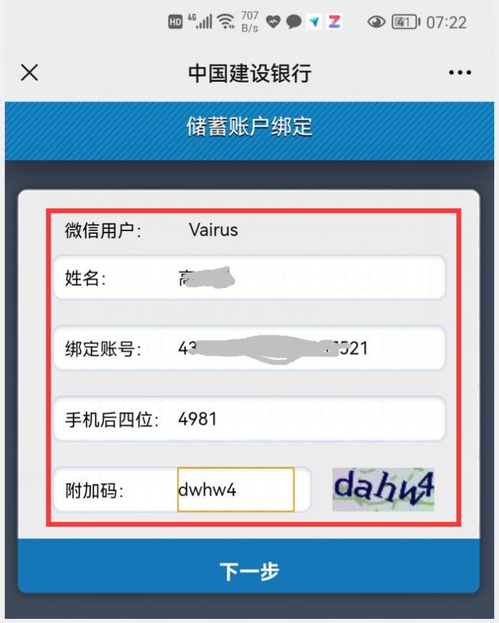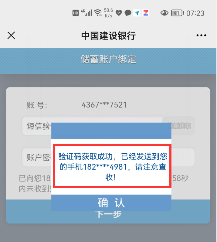 填写姓名和账号后,点击下一步,银行就会通过短信的形式向你发送验证码。