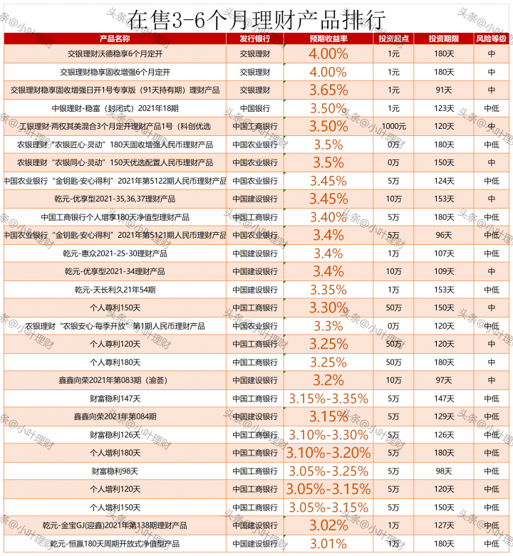 五大行在售3个月内收益率在3%以上的理财产品排行榜