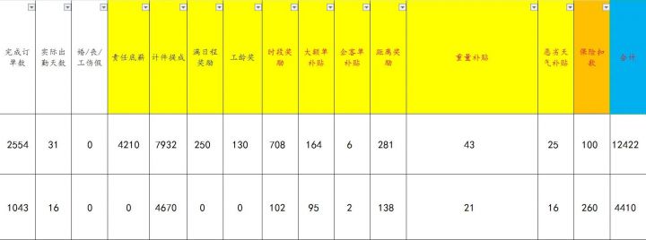 我们这边单价比较低一单是4.45元,有距离、时间、恶天气和大单等补贴(详细见工资表图片)。我这个月一共接单1043单,有个全职的接单2554单,他有底薪,我们来算一下看看是不是和我每单的钱一样: