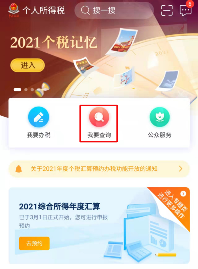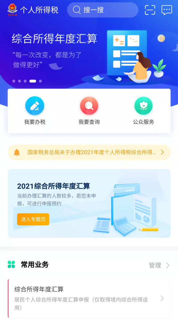 接下来就可以进行申报了,打开个税APP,点击首页的“2021综合所得年度汇算”。