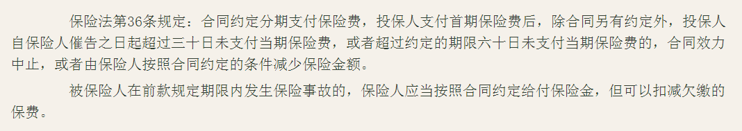 在此期间,即使没交保费,万一发生保险事故,保险公司也要承担赔偿责任,只是会扣除当期未交保费。