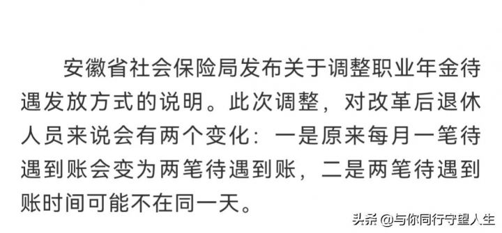 比如,据安徽人社消息,关于调整职业年金待遇方式的说明,此次调整对改革后退休人员来说有两个变化,一是原来每月一笔待遇到账会变为两笔待遇到账。二是两笔待遇到账了时间可能不在同一天。对已经参加机关事业单位养老保险且在2014年10月1日后退休的人员,按新办法核定后,按月领取养老金和职业年金,其中基本养老金由属地经办社保金购发放,职业年金由省经办社保机构统一发放。