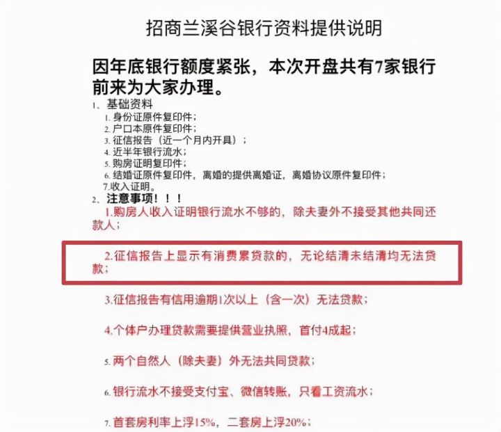 比如2017年,南京江北高新区招商兰溪谷开盘的时候,官方发布了一条关于贷款的通知:征信报告上显示有消费类贷款的,无论是否结清均无法贷款
