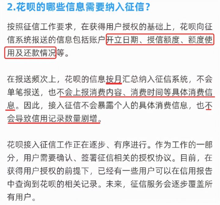 在报送频次上,花呗的信息按月汇总纳入征信系统,不会单笔保送,具体消费信息不在其中。