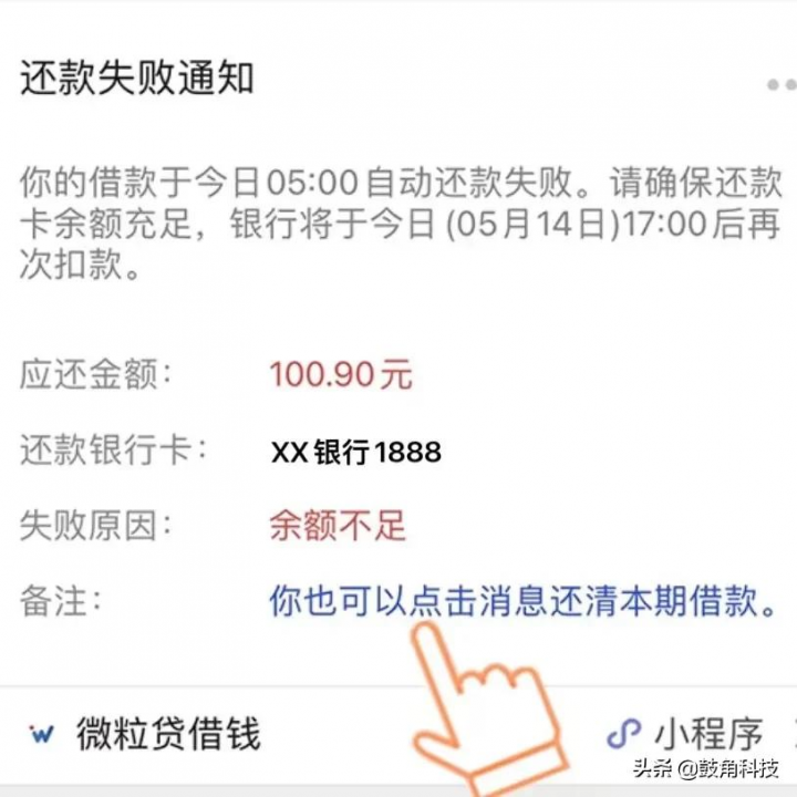 在还款日当天自动扣除还款金额,及时保证还款银行卡或者零钱余额充足,以免出现逾期。“侦探小鼓”亲测可以提前还款只要点开支付—微粒贷借钱——点击提前还款就能操作成功。要是自动还款失败,可以点击“微粒贷”公众号在还款失败通知栏点击还款失败消息通知手动还当期借款就可以了。