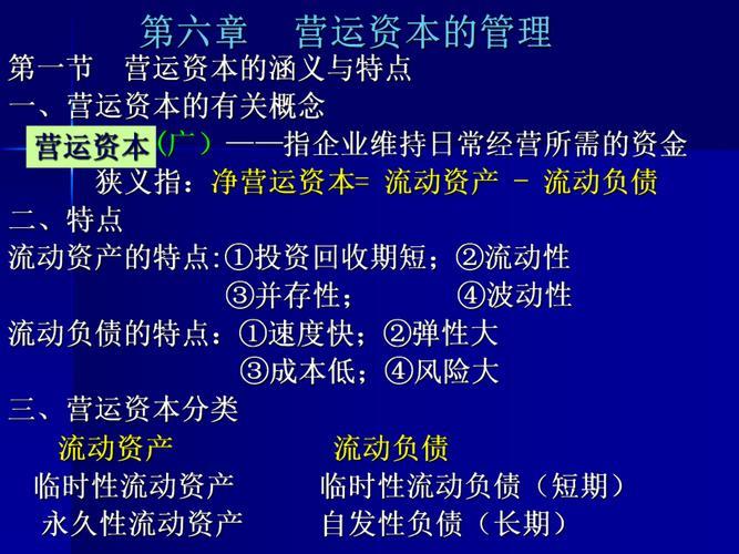 广义的营运资本是指企业的流动资产总额,而狭义的营运资本则被定义成流动资产超过流动负债的部分,也被称为净营运资本。