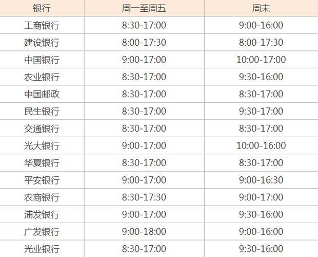 | 中国工商银行 | 9:00-17:00 | 9:00-17:00 |