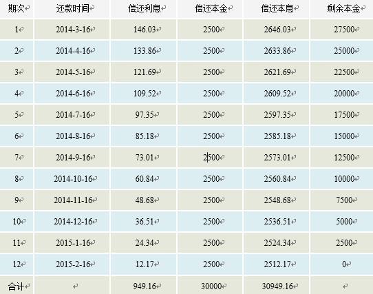 利息 = 本金 * 月利率= 10000 * 0.03041666666666667= 30.41666666666667