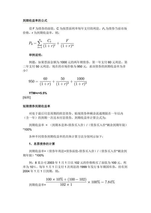 债券到期收益率(yield to maturity,YTM)是指投资者在购买债券后,持有到期所获得的总收益与其投资本金的比率,通常以年利率表示。YTM是衡量债券投资收益的重要指标,投资者在投资债券时应重点关注YTM。