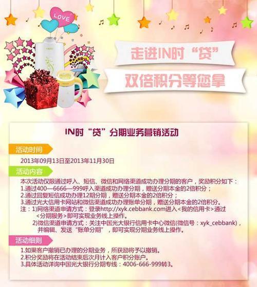 - 参加积分活动: 光大银行经常推出积分多倍活动,例如每周五的“约惠星期五5倍积分GOGOGO”,持卡人可通过参加活动获得额外积分。