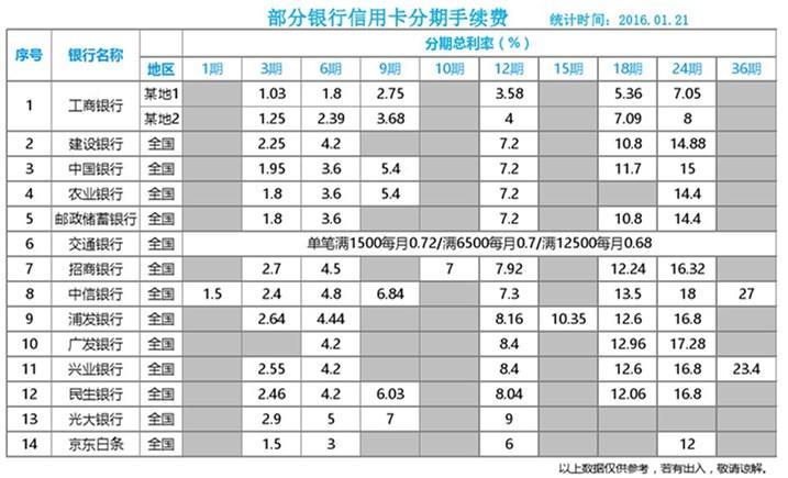 信用卡分期的手续费一般按一定比例收取,不同银行的收费标准不同,选择的期数不同,费率也不一样。以某银行为例,其信用卡分期手续费率为: