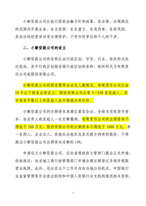 - 注册资本要求: 小额贷款公司最低注册资本为5000万元人民币。