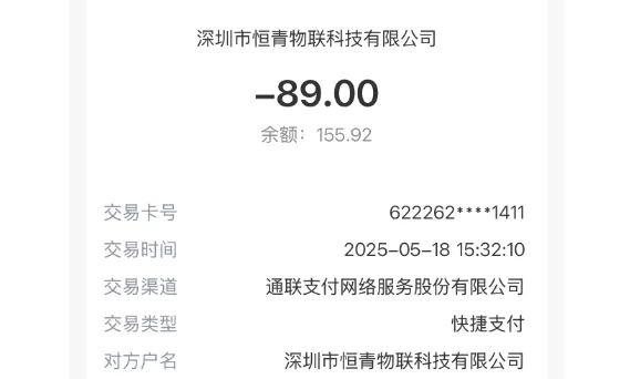 2、再就是用户反馈被深圳恒青物联科技有限公司扣了89元;、而和恒青生活合作的平台有千享鑫、天美贷、我来数科都存在扣用户会员费的情况。