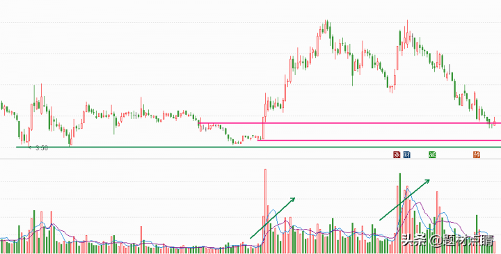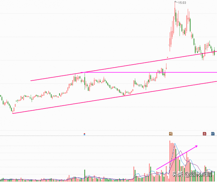 股价前期进行迅速拉升并放出巨量且密集,可以看出该股票当前受到大量的市场资金的关注和参与,后期延续上涨的动能相当大。当前股价回踩至红色上升通道上轨线附近,这时我们可以在当前价格附近先介入一部分仓位,如果股价往下继续调整,我们可以在粉色线附近进行补仓,风险控制在通道下轨线下方,后期如果股价突破15.03新高,我们可以加大持有的仓位。