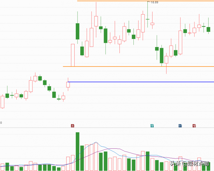股价当前处在深黄色箱体中运动,我们目前不适宜介入,仍需等待股价回踩至箱体下轨深黄色支撑线附近或突破16.89新高再制定相应的仓位进行介入,箱体下轨线附近介入时,止损设置在蓝色支撑线下方附近。在突破16.89新高时介入,止损视情况而定。