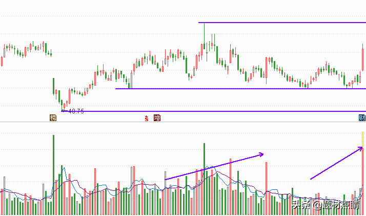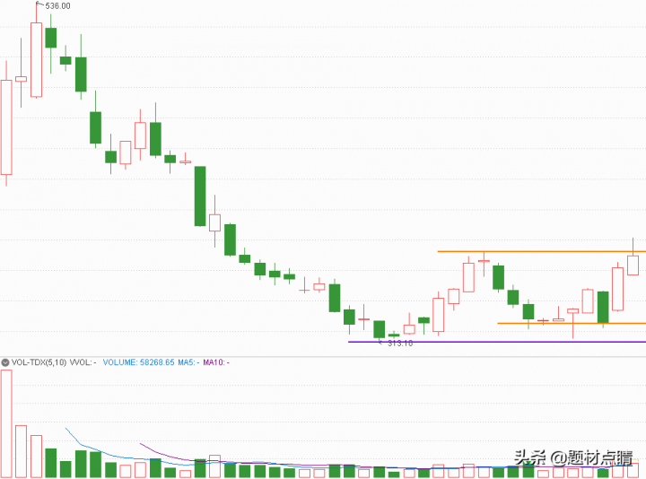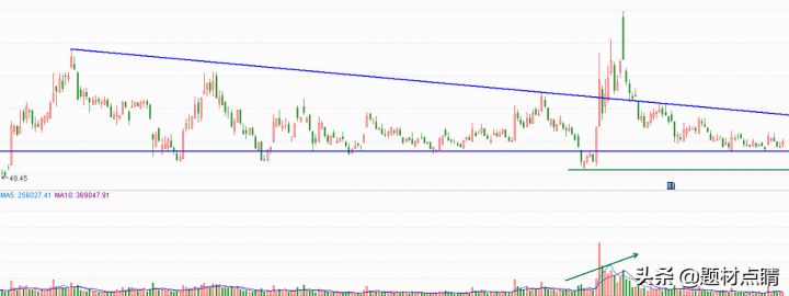 如上图所示不难看出,该股前段时间有一段冲高放量的过程,这可以说明该股票已经有一部分市场资金介入其中。当前股价已回调至蓝色水平支撑线附近,笔者的建议是可以在当前股价附近介入一部分初始头寸,然后把止损设置在绿线下方,随后等待股价突破上方蓝色压力线时再加大持有的仓位。