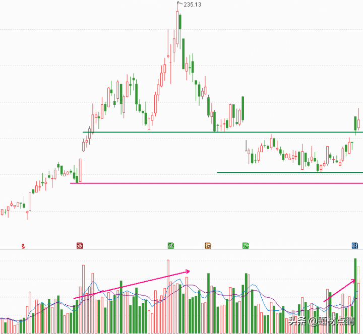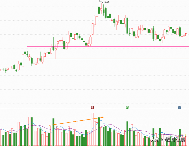 如上图我们同样很容易看出该股票当前的成交量相当巨大,市场活跃度非常高。当前股价已突破最上端绿色线,我们可以在当前价位采取介入部分资金的方式,随后等待股价后期的发展,如果股价继续向下调整,我们可以在最下一条绿色线附近进行补仓,风险我们可以控制在红线水平支撑线下方。