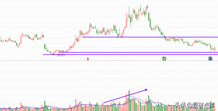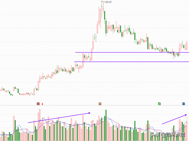 股价当前回踩至中间紫色线附近受到了小支撑,我们可以在当前价格先介入一部分仓位进行参与并把防线控制在最低紫色线下方附近,后期等待股价向上突破最高紫色线时在进行加仓。
