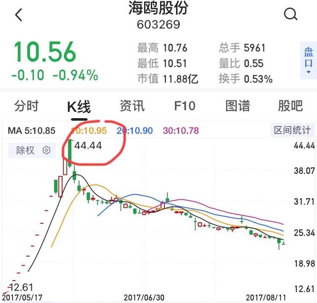 举个栗子:603269海鸥股份,在上市不久,出现阳包阴的涨停,二连板后,操盘手打出44.44的盘口语言,之后股价一路狂跌,跌去一半多才止跌回升。