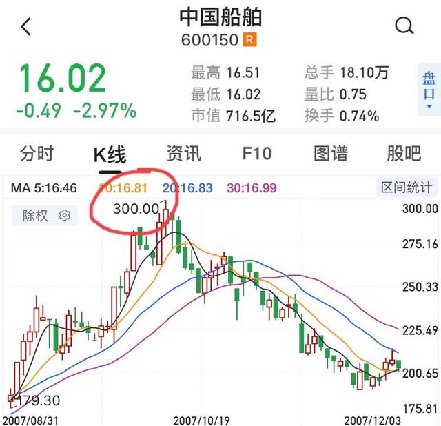 600150中国船舶,在大牛市尾端,时间是2007年10月11日,发出300.00的盘口语言后,股价一泻千里,跌到30元,才回升。