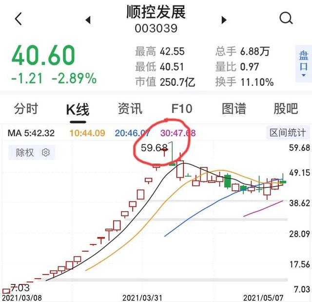 也有非叠数的盘口语言,例如003039顺控发展,曾经的21连板王,在2021年4月14日(神奇的日子:死要死),发出神奇盘口语言:59.68,意思是:我就溜吧。