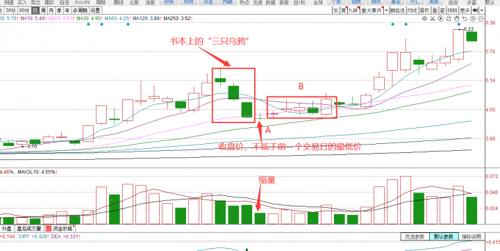 如果你无法在A点的“收盘价不低于前面最低价”操作买点,你也可以观察到B区域,是违背了“三只乌鸦”的逆转形态的,可以考虑“买点”。
