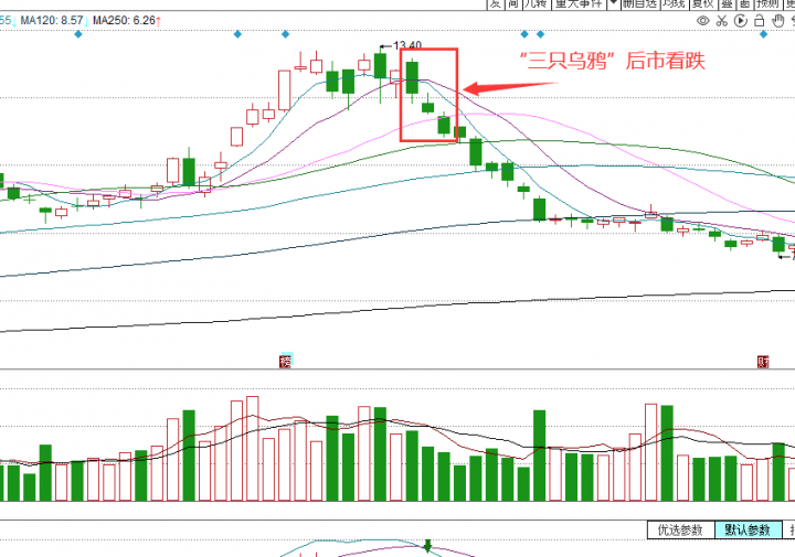 如果“三只乌鸦”形态出现的相对位置比较高,或者刚经历完一波充分的上涨,将会预示后市下跌。有句俗语说:“好事不出门,坏事长翅膀”,说的就是“三只乌鸦”形态。