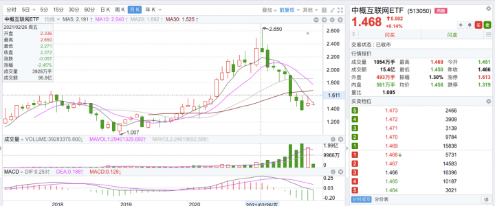中概互联网ETF的成分股都是非常优质的资产,当经历了1.372的最低点之后中概互联网ETF的投资者里面基本上已经没有投机者了,只剩下坚信中概互联网ETF的成分股都是非常优质的价值投资者,当底部确认了之后买入低估的中概互联网ETF就要非常坚定。