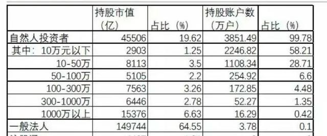 在回答这个问题之前,首先来看一份关于A股市场投资者拥有资金和人数的比例