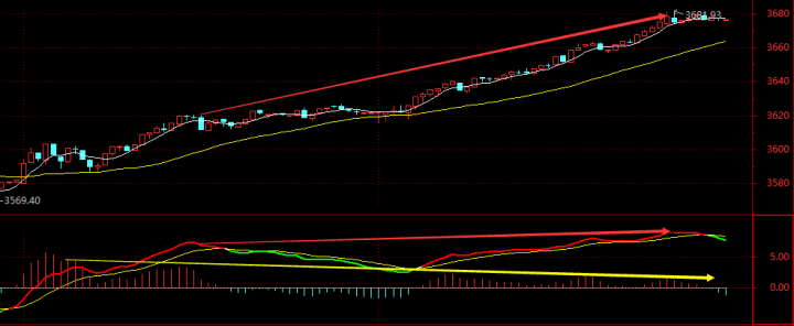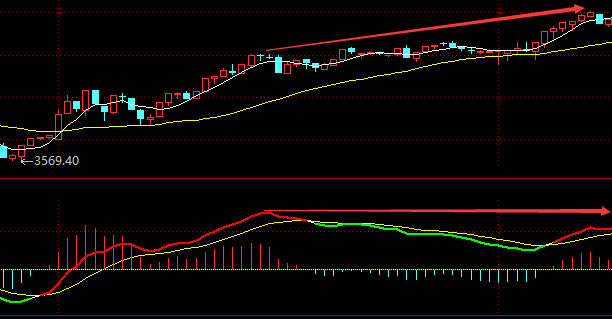 图中确实发生了指数上行,但是MACD并没有写死,虽然出现了MACD的DIFF或红柱高度的顶背离迹象,但还不能确认就一定会出现顶背离,需要等待死叉写死后才能确认是否出现顶背离。