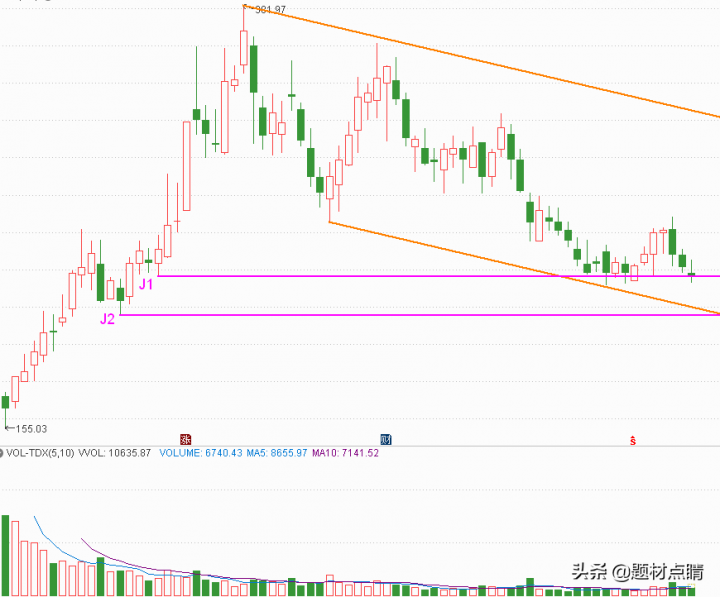 股价当前处在下行通道中运行并处在J1位置附近,我们对此采取的交易策略是在当前价格附近先介入一部分头寸并且风险控制在J2位置下方附近,后期如果股价恢复上涨并向上突破通道上轨时再加大持仓头寸。