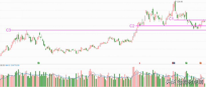 如上图所分析,当前股价处在C1附近,我们可以等待股价有效突破C1时适当的介入一部分仓位,并在C2位置进行补仓止损控制在C3下方附近。如果股价没有突破然后进行继续回踩,我们可以在C2位置进行介入部分头寸然后在突破C1时进行加仓。