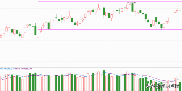 指数当前处在粉红色箱体中运行并且近期处在触底反弹阶段,我们可以根据指数对个股采取的策略是逢低做多,止损在粉红色下轨下方附近,突破箱体上方压力位时可以对个股增加适当的仓位。