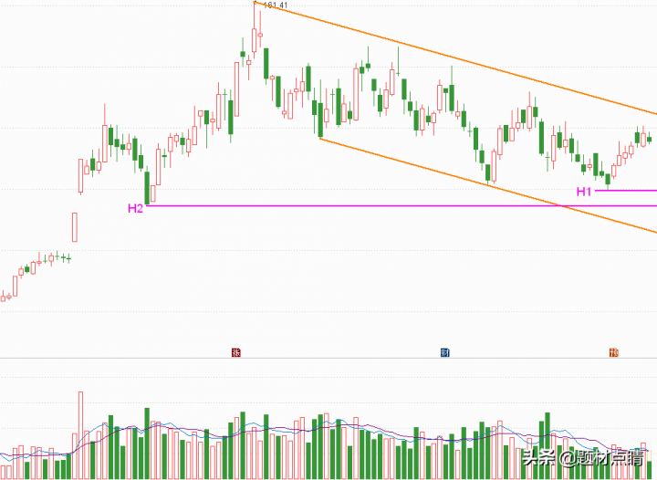 股价当前处在深黄色下跌通道中运动并达到通道上轨附近,我们对当前股价采取的应对策略是观望,等待股价进行回踩至H1附近再进行介入,风险控制在H2位置下方附近,或等待股价上破通道上轨压力线在进行介入。