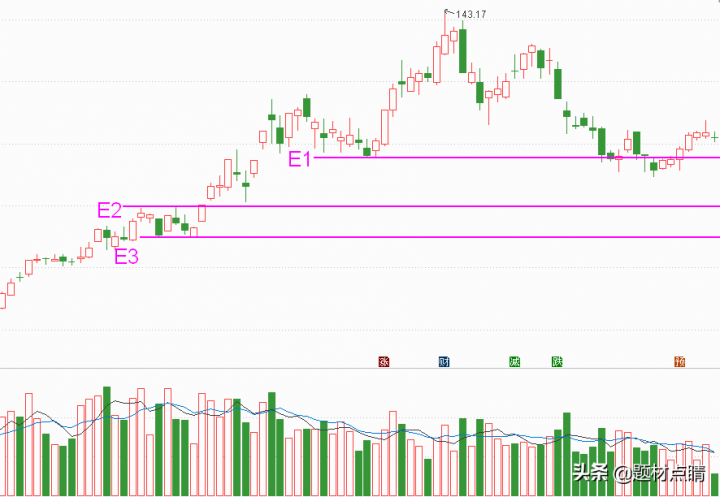 以当前股价所处的位置及技术分析,我们可以先制定一部分仓位在当前价格进行参与,在E1、E2附近进行补仓,风险控制在E3位置下方附近。