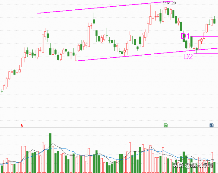 股价当前处在粉色上行通道中运行,如上图所示,当前价格暂时不宜介入,我们需要等待股价回踩至D1或者通道下轨附近进行介入交易或补仓,风险控制在D2下方附近。