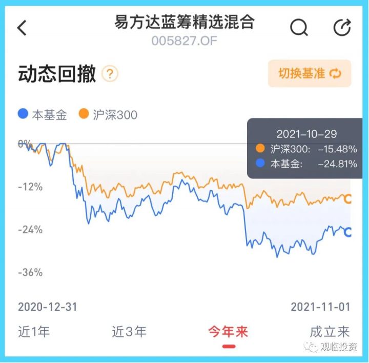 公募一哥张坤在2018年全年单边下跌的时候,最大的亏损也就是回撤了15个点,但是今年,他的易方达蓝筹精选混合,截至目前(数据取自10月29日收盘)已经回撤了接近25%了,这还是最近这2个月有所回升之后的数据(8月20日最大回撤达到-31.88%)。张坤目前是公募基金中从业年限、业绩回报以及管理规模等各项指标都排名靠前的顶流基金经理,管中窥豹,可见一斑,所以说今年整体上还是比较难做的。