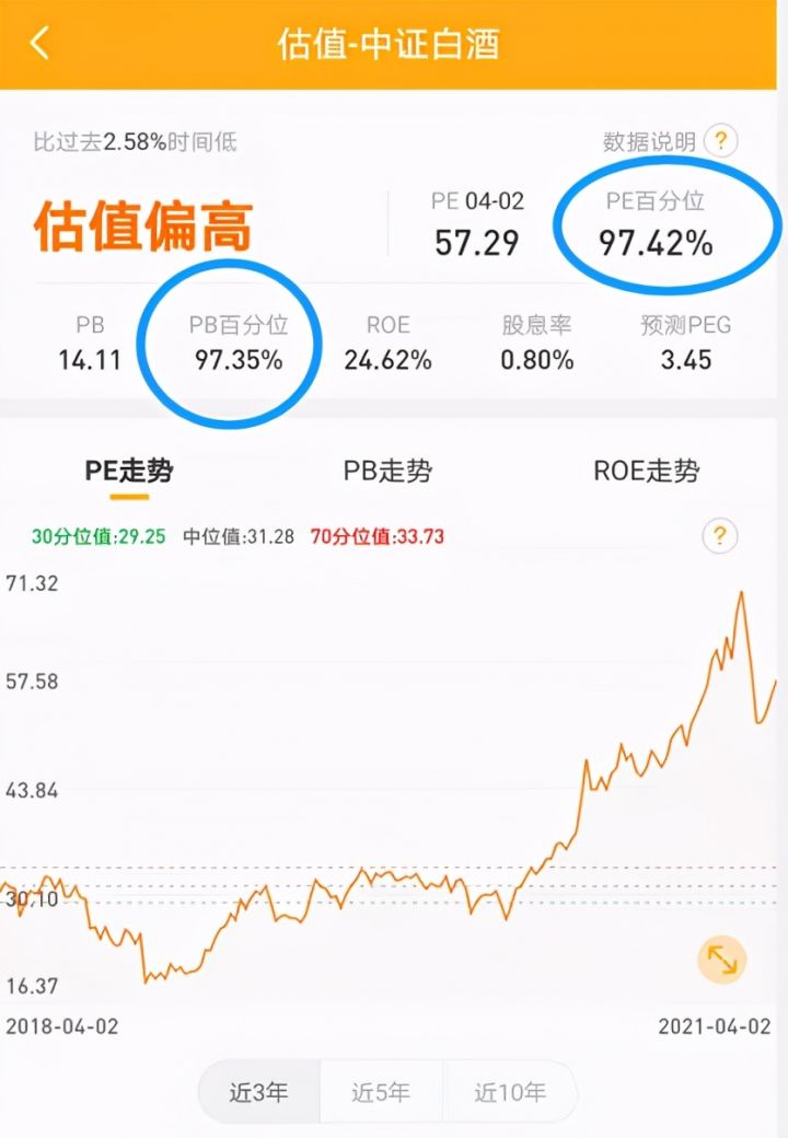 在支付宝、蛋卷基金等这些平台上是可以查看的,以蛋卷基金为例,比如我们查看当前的白酒行业,可以看到,显示估值偏高,PE、PB 百分位两者都很高。