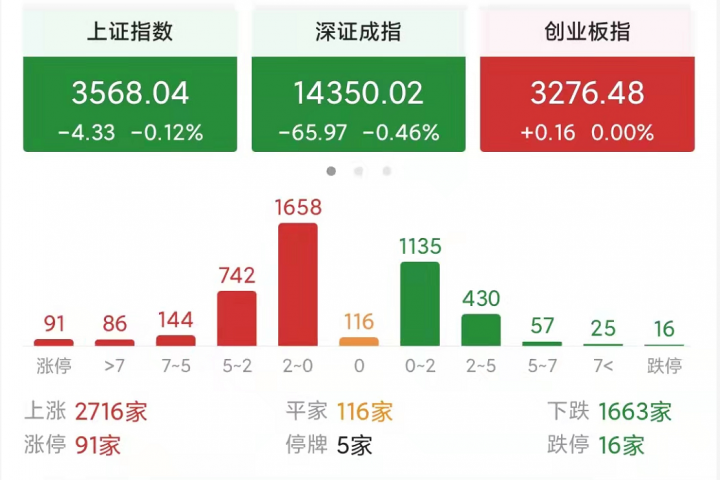 今天收盘三大指数弱势整理,上证指数跌幅为0.12%,深证指数跌幅为0.46%,创业板指数涨0.16个点;个股普涨状态,上涨个股有2716家,下跌个股有1663家;个股方面多空博弈,其中煤炭、电力和钢铁等周期股领涨,酿酒和医药等个股领跌,白酒出现暴跌成为今天A股重灾区,白酒已经全军覆没了,其余个股涨跌幅度不大,个股表现一般,只有结构性的个股机会。
