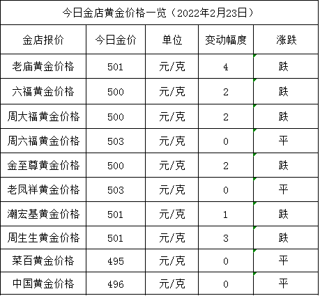 今日是2月23日,应大家要求,小金今天在金价报表中添加了《中国黄金》的报价。目前,一直涨涨涨的金价再次迎来微跌,跌幅最大的为老庙黄金,跌幅高达4元/克,让老庙失去金价第一的地位,报价501元/克。而金价第一的金店为周大福与老凤祥,报价503元/克,金价最低的金店依旧为菜百,价格一直没有变化,报价495元/克。今日黄金价格高低差为8元/克,相对偏大。