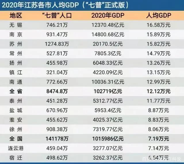 以2020年gdp总量以及最新的第七次人口普查数据计算人均gdp的结果来看,江苏省经济最发达的无锡、南京、苏州三地的人均gdp都超过了15万元人民币。13市里5地的人均gdp不足10万元人民币,这五市均为苏北地区。经济较为落后的连云港和宿迁分别为7.14和6.54万元。苏北地区人均gdp最高的是扬州,达到了13.26万元,这可能也归功于扬州没有那么北的缘故。