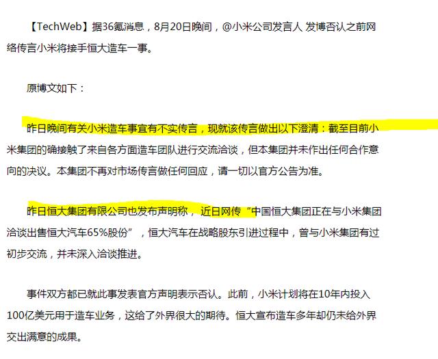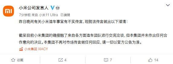 根据小米公司发言人的微博,已经对这些传言进行了澄清,而且小米发言人表示现在小米接触了各方面造车团队,但是并没有做出任何合作一项的决议。