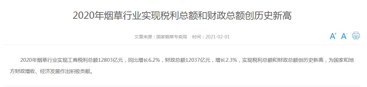 2020年烟草行业实现工商税利总额12803亿元,同比增长6.2%,财政总额12037亿元,增长2.3%。